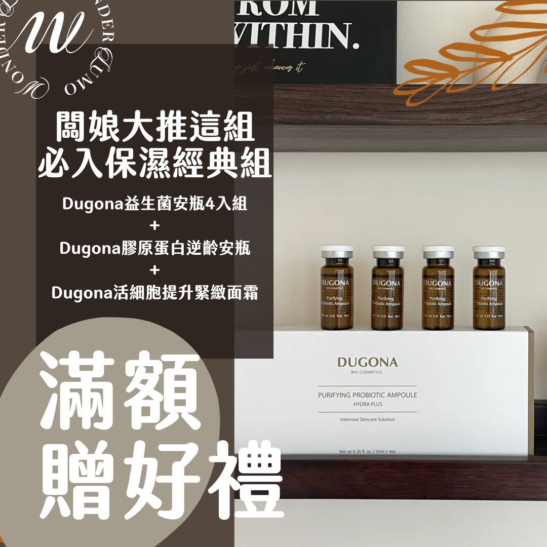 ( DUGONA 益生菌鎮定補水安瓶 (一盒4入)*1+DUGONA 膠原蛋白逆齡保濕安瓶 (一盒4入) (無凍乾粉)*1+DUGONA 活細胞提升精華緊緻面霜*1)