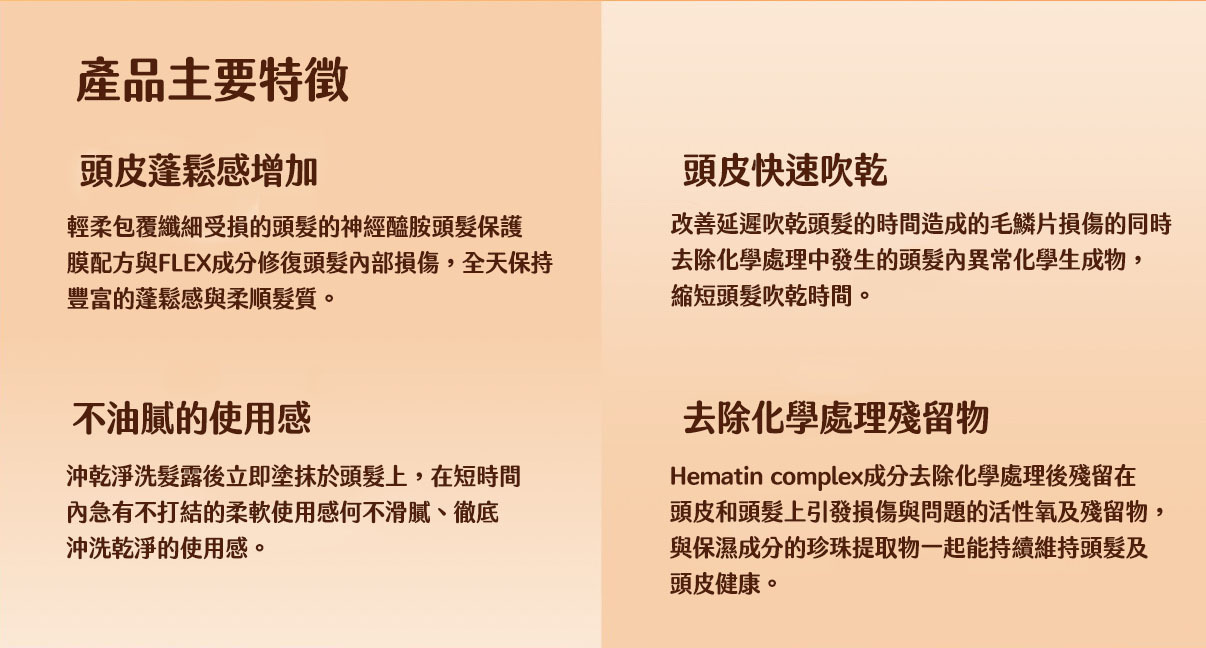 ◆去除化學處理殘留物 - Hematin complex 血紅素成分去除染髮處理後殘留在頭皮和頭髮上引發損傷與問題的活性氧及化學殘留物,與保濕成分的珍珠萃取物一起能持續維持頭髮及頭皮健康