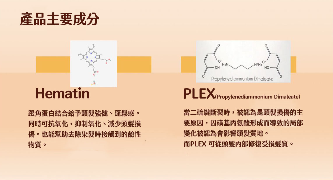 ▴血紅素 - 與角蛋白結合,強健頭髮、增加蓬鬆感,抗氧化特性幫助減少頭髮氧化及受損,也能幫助去除染髮時接觸到的鹼性物質。