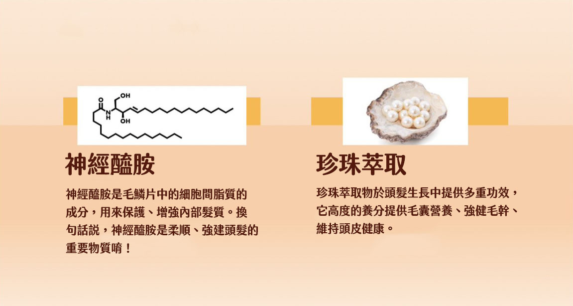 ▴珍珠萃取物 - 於頭髮生長中提供多重功效,提供毛囊營養、強健毛幹、維持頭皮健康